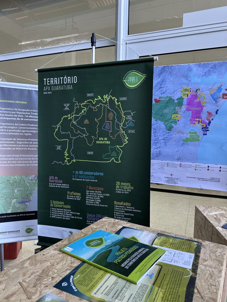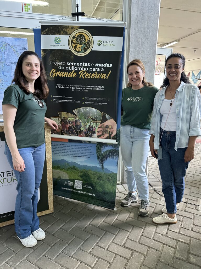 Representando a instituição, estiveram presentes Renata Garret Padilha, pelos projetos Diálogo UC e Conecta UC, e Mônica Moreno Gabira e Carolina Cury Muller Cardoso, pelo projeto Sementes e Mudas do Quilombo para a Grande Reserva. Durante o evento, o Mater Natura apresentou suas iniciativas, que priorizam diálogo, cooperação e fortalecimento de relações com comunidades locais em Unidades de Conservação do litoral paranaense.