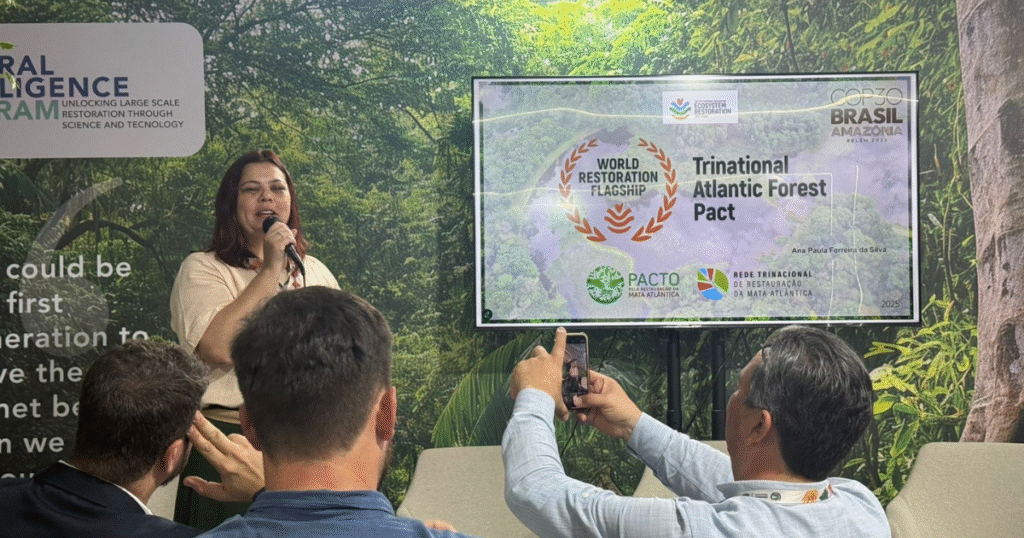 O Pacto pela Restauração da Mata Atlântica e a Rede Trinacional de Restauração da Mata Atlântica convidaram a Ana Paula a participar do evento “Scaling Climate Adaptation Through Nature-Based Restoration”, dedicado a soluções de adaptação a partir da restauração baseada na natureza. Em sua apresentação, ela destacou o trabalho destas instituições que foram reconhecidas pela Organização das Nações Unidas (ONU) como uma das Iniciativas de Referência da Década da ONU da Restauração de Ecossistemas (World Restoration Flagships). Em sua fala ela esclareceu o significado dessa menção para o avanço da governança e da articulação territorial, enfatizando como os processos de planejamento, cooperação técnica e participação comunitária são fundamentais para dar escala às ações de restauração.