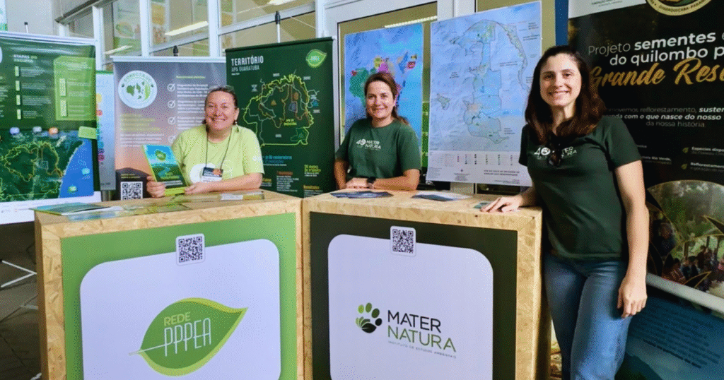 O Mater Natura apresentou materiais dos projetos Diálogo UC, Conecta UC e Sementes e Mudas do Quilombo para a Grande Reserva, fortalecendo a integração entre sociedade, pesquisa e biodiversidade. Representaram a instituição Renata Garret, Carol Muller e Monica Gabira.