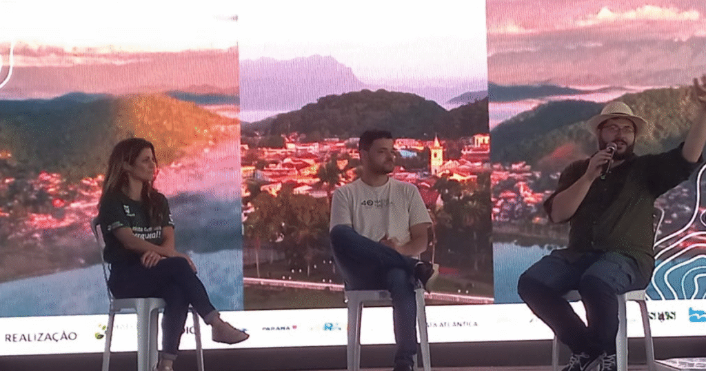 Juliana Pina e César Tavares, técnicos do Mater Natura – Instituto de Estudos Ambientais, ao lado de Gabriel Marchi, da produtora Olhar Nativo, durante a mesa-redonda sobre riscos climáticos no litoral do Paraná, realizada no Festival Cidade das Aves.